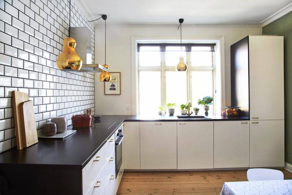 Темный пол придаст помещению глубину, а яркие контрасты — в виде фартука или элементов декора помогут кухню расцветить. Что касается освещения, то дополнительную подсветку можно сделать над рабочей зоной и около обеденного стола.