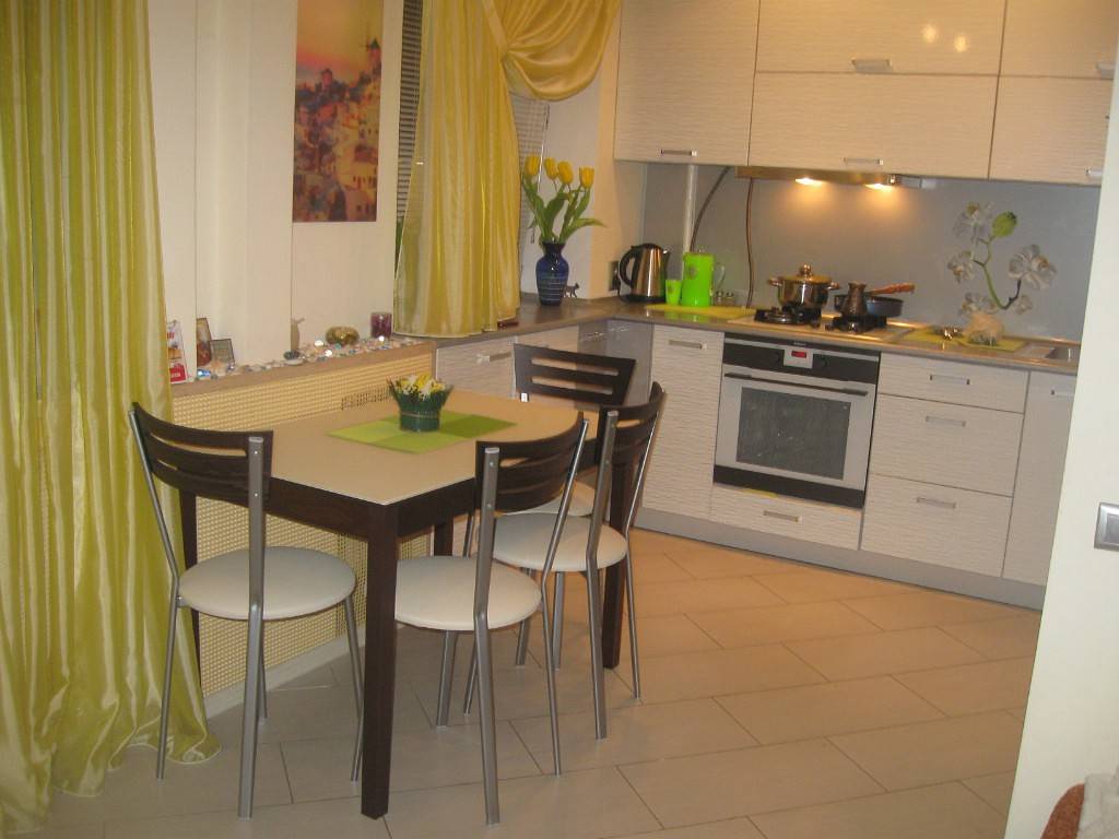 5. Кухонную мебель следует устанавливать вдоль одной из стен, предварительно определившись с местом расположения рабочей зоны и холодильника, после чего можно приступать к размещению мягкого уголка или обеденного стола со стульями.