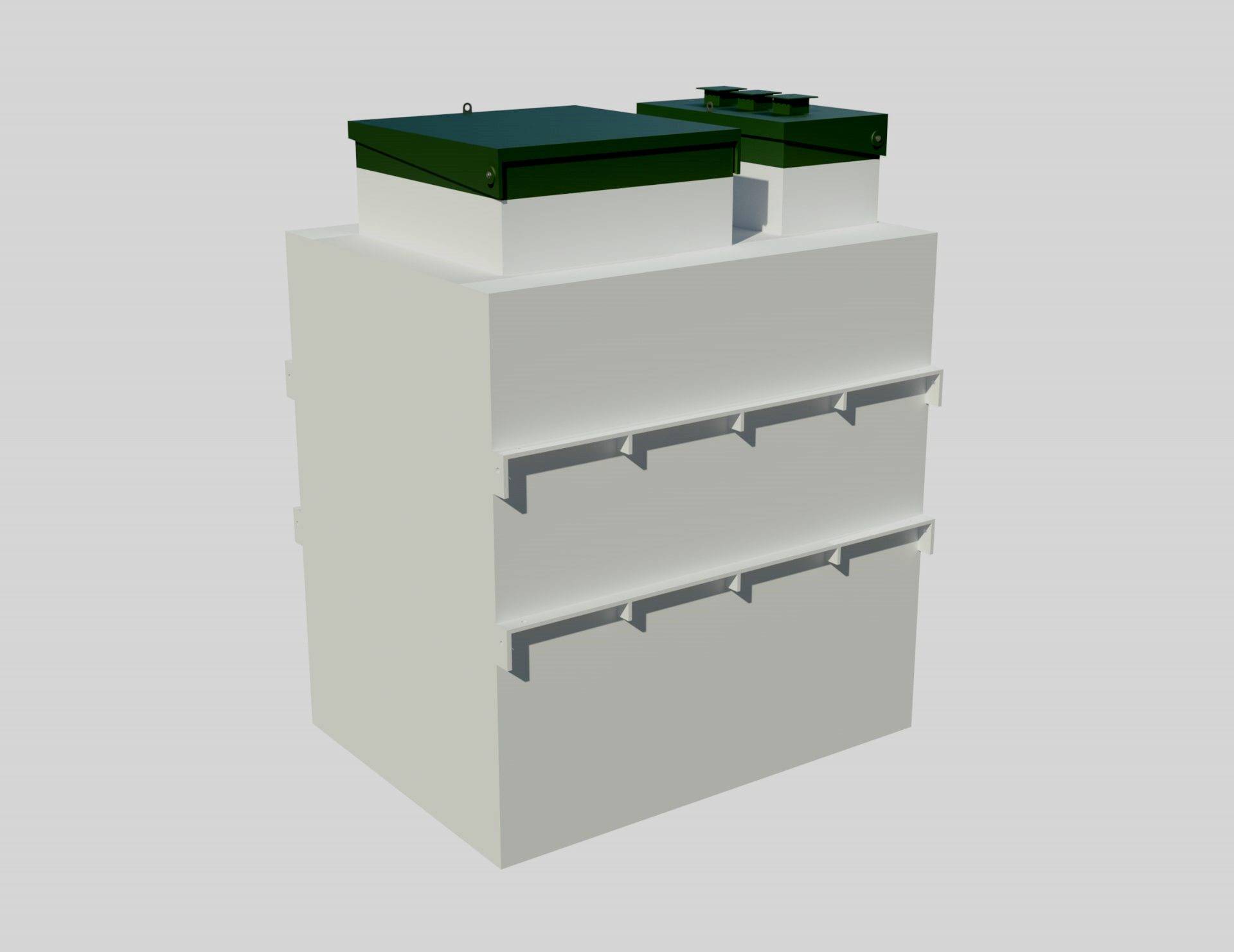 Производительная установка предназначена для обслуживания не более 12 человек. Можно подключить как одно строение, так и несколько. Собственная масса – 300 кг, потребляемая электроэнергия – 2,2 кВт в день. Подводящая труба глубиной 750 мм, отводящая – 850 мм. Основание 1,2*2,8 м. Трехкамерное приспособление с горизонтальной установкой оснащено одним насосом.