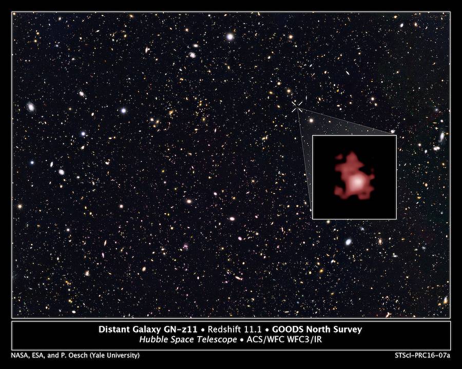 Галактика GN-z11, показанная на вставке, видна в прошлом на 13,4 млрд лет, всего через 400 млн лет после Большого взрыва, когда возраст Вселенной составлял всего 3% от ее нынешнего возраста. Учитывая расширение Вселенной, сейчас на деле она находится в 32 млрд световых лет от нас