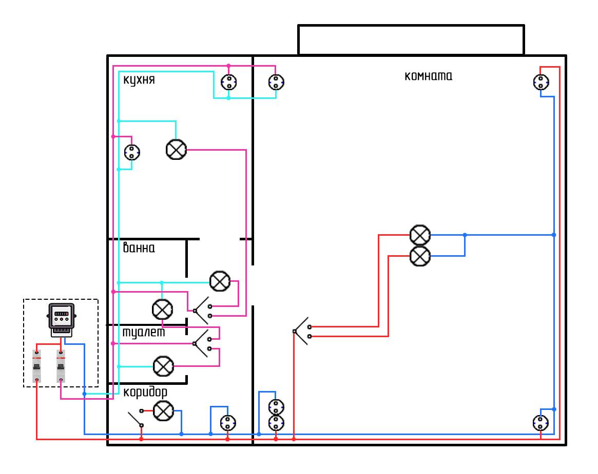 Как видно из схемы, электропроводка состоит из двух ветвей. Одна из них подает ток в коридор (прихожую) и жилую комнату. Вторая ветвь питает светильники и электрические приборы в ванной и на кухне. Интересным фактом является то, что каждая линия используется как для освещения, так и для обеспечения подачи тока к электроприборам.