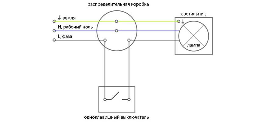 Работы по подключению одноклавишного выключателя (проходного) осуществляются в следующей последовательности: