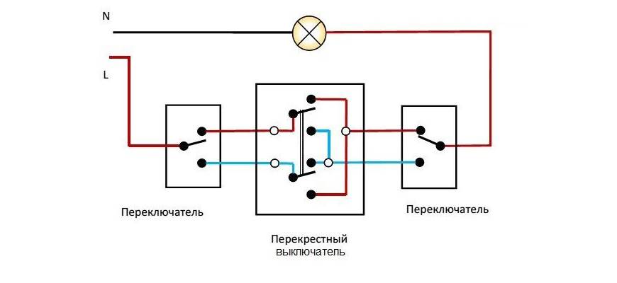 Часто можно услышать, что такое большое количество контактов нужно для обеспечения работы выключателя по принципу «перекидывания». Но такая формулировка не вполне соответствует действительности. Так как выключение происходит, когда контакты, входящие в состав двухклавишных выключателей и управляющих одной линией, просто перемещены в разные положения.