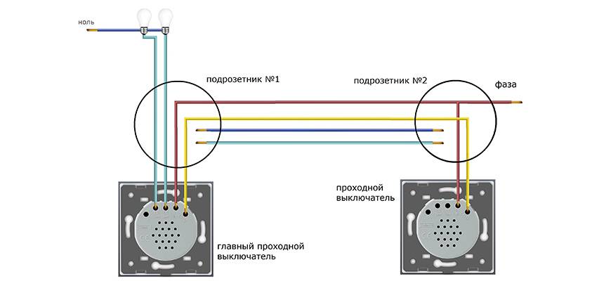 Подробные инструкции подключения проходного выключателя на 2 клавиши мы привели в другой нашей статье.