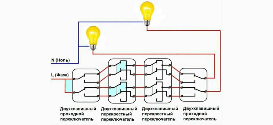 Так, если у проходных включателей, оборудованных единственной клавишей, их всего 3 (а у обычных вообще 2), то у двухклавишных — 6: