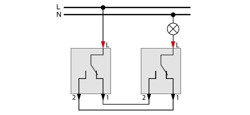 Для управления одним световым прибором из разных точек помещения используется минимум два проходных выключателя. Когда изменяется положение клавиши – цепь замыкается, лампочка загорается. При выключении любого из двух переключателей цепь размыкается, светильник гаснет. Таким образом, когда клавиши проходных переключателей находятся в одном положении – свет горит, когда в разном – гаснет.