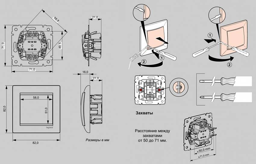 - Если вы собираетесь снять действующий выключатель из коробки, сначала снимите фальшпанель и удалите фиксаторы. Затем ослабьте узлы крепления в коробке, достаньте сердцевину. Открутите провода подключения и удалите коммутатор из цепи освещения.