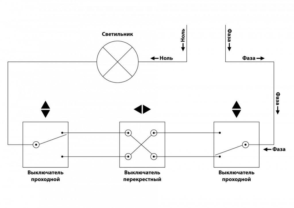 Как подключить перекрестный промежуточный выключатель переключатель с трех мест схема перекрестного