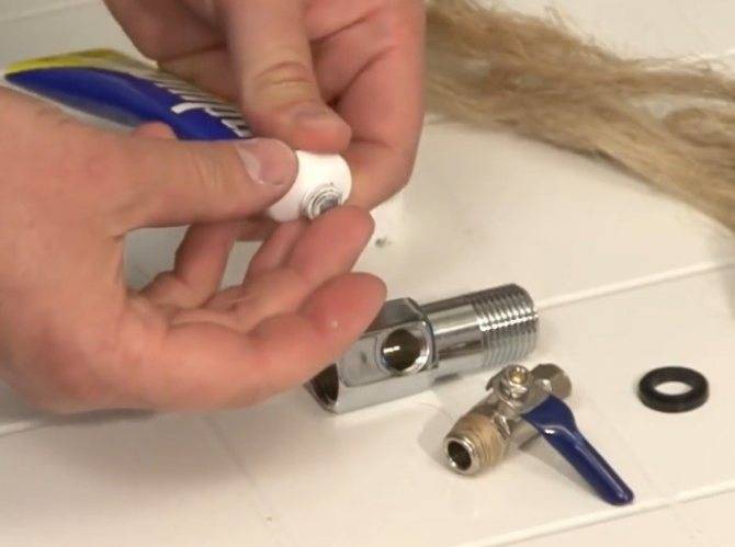 | Далее в магистраль нужно врезать тройник-адаптер. Для этого выполняем его предварительную сборку — резьбовое соединение уплотняется сантехническим льном, который дополнительно промазывается силиконом. Также можно использовать ленту фум, но она не так надежна, как старое проверенное средство. Устанавливаем затем тройник в магистраль – удобнее всего это сделать на выходе холодной воды, перед установкой гибкой подводки до смесителя. Обязательно уплотняем соединения прокладками и льном. |