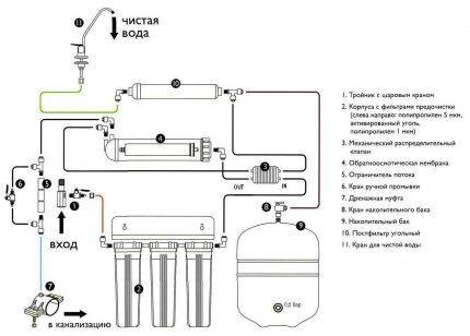 На этой схеме подробно отражен порядок подключения и функционирования системы обратного осмоса и обозначены все ее основные элементы