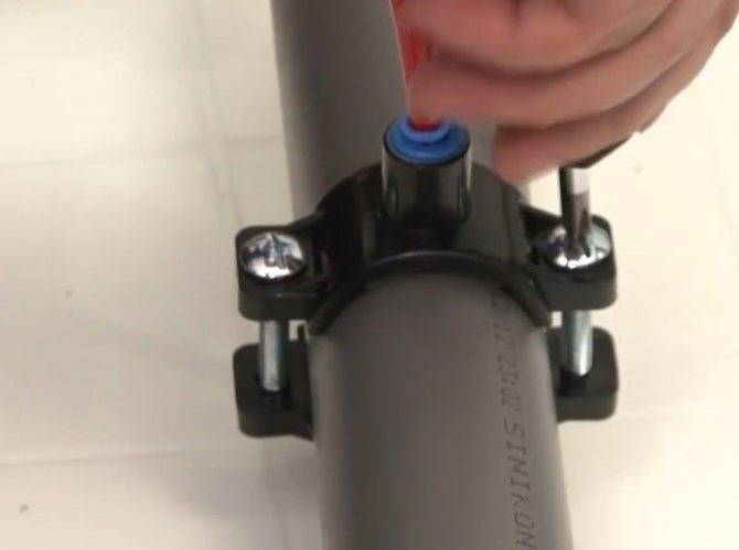 | Затем трубку от дренажного шланга нам будет нужно врезать в канализацию. Для этого в пластиковой трубе слива сверлим отверстие на 7 мм. Шланг вставляем в специальный хомут, идущий в комплекте, и проталкиваем внутрь трубы. Фиксируем винтовые зажимы на хомуте. |