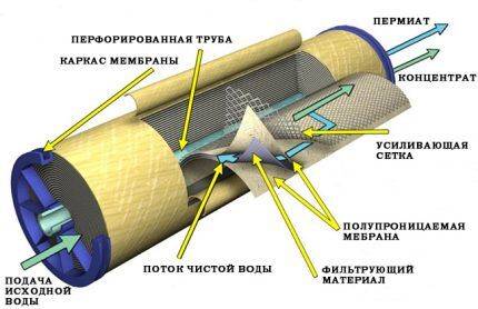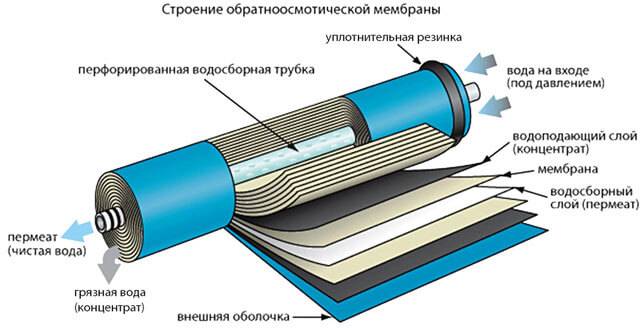 Попадая в обратноосмотическую мембрану, вода проходит через ее полупроницаемые слои и разделяется дальше на два потока.