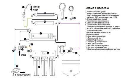 Перед монтажом прибора, узнайте давление в водопроводе. Если значение меньше, чем у параметра выбранного фильтра, потребуется включить в состав нагнетающий насос, если больше, то понижающий редуктор. Когда нужно постоянно иметь определенный запас чистой питьевой водички, дополните комплект резервным баком. В типовой комплект входят: