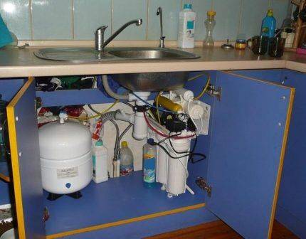 Несмотря на внушительные размеры, обратноосмотическая установка полностью незаметна на кухне, так как устанавливается фильтр под мойку.