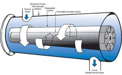 Вода, проходя внутри корпуса, просвечивается ультрафиолетовыми лучами и обеззараживается.