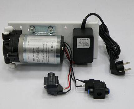 В конструкции блока предусмотрен насос с приводом от электрического двигателя, который обеспечивает подачу воды под давлением к мембранному фильтру (часть блоков не оснащается насосами).