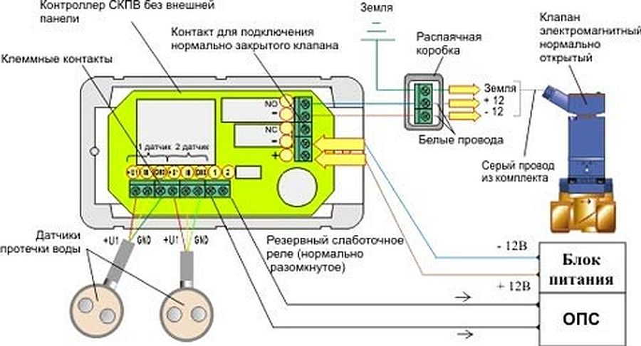 Управляющий модуль является связующим звеном между контролирующими появление воды датчиками и кранами, регулирующими ее подачу.