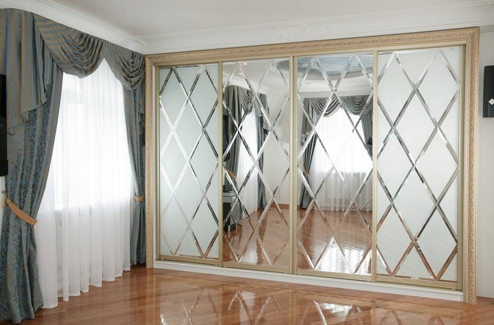 классический вариант оформления любой модели – зеркало. Оно визуально корректирует размеры помещения, делая его более светлым и просторным. Однако в некоторых случаях лучше всего использовать не чистое зеркальное покрытие, а с каким-нибудь орнаментом или рисунком. Такая модель смотрится оригинальнее обычной.