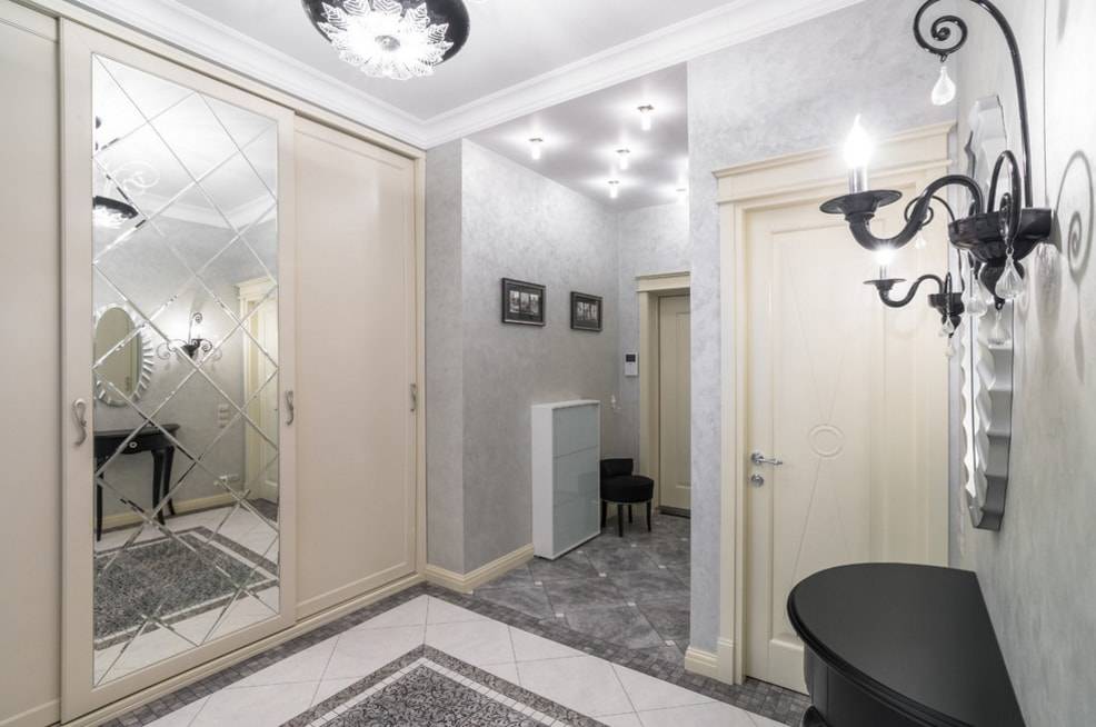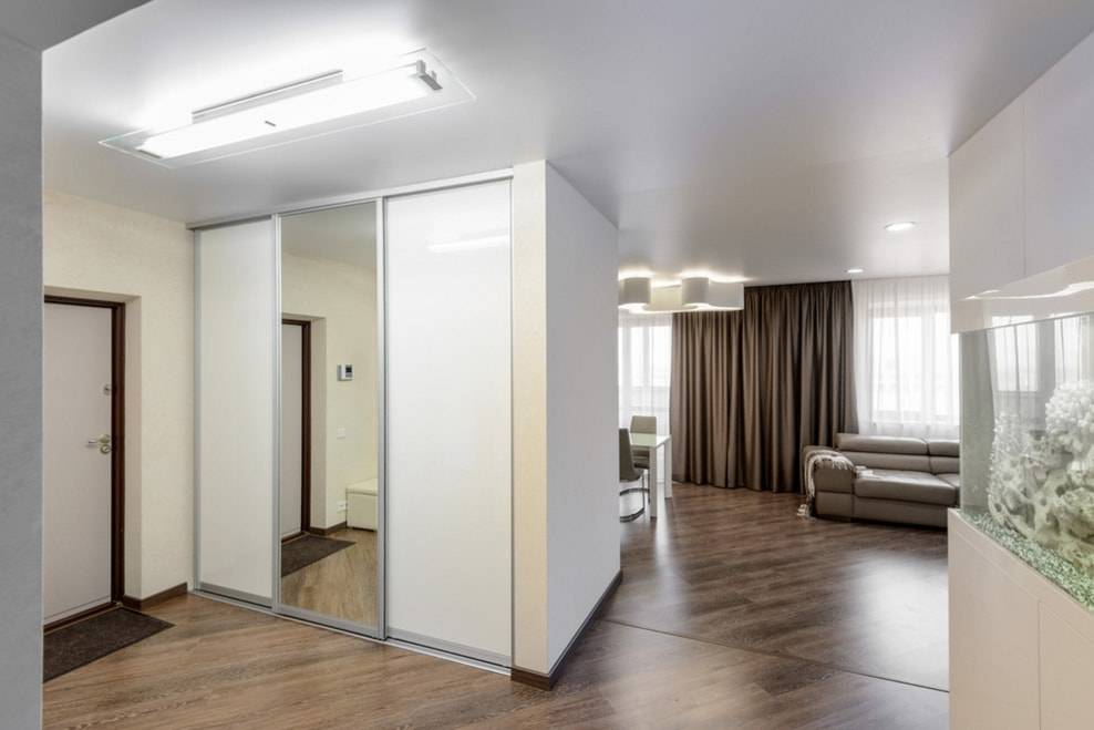 - Дверцы просто обязаны быть зеркальными. Если в случае просторных залов есть элемент выбора (створки могут быть глухими, содержать элементы орнамента или иных декорирующих элементов), то в случае помещений малого размера зрительное увеличение пространства — это весьма насущная необходимость.