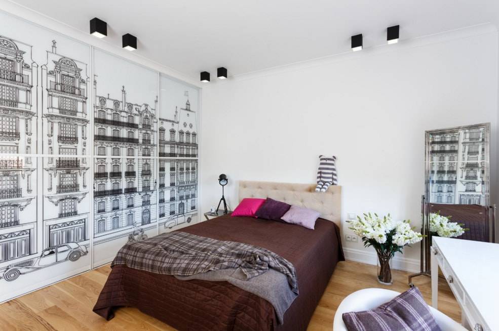 - для маленькой спальни – кровать можно поставить почти впритык к раздвижным дверцам шкафа.