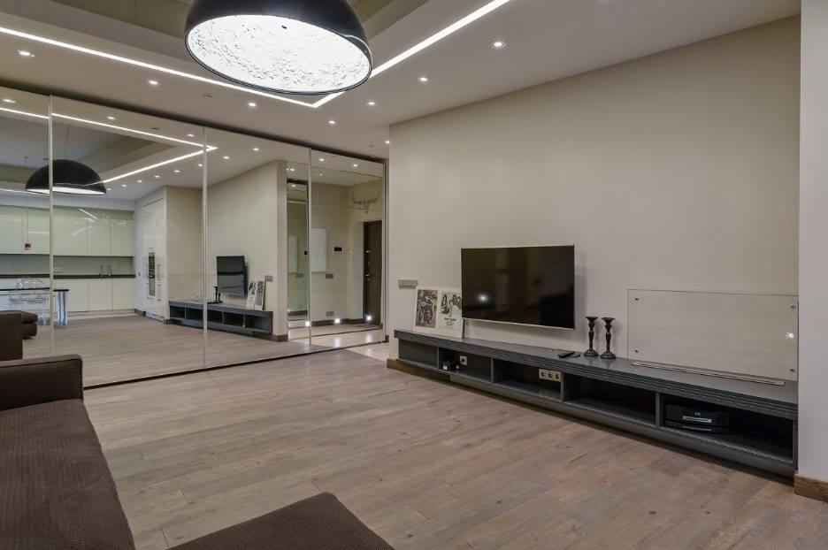 Значительная площадь стен, полностью отделанная зеркалами, ещё больше зрительно увеличит пространство помещения, добавив в него объёма и воздуха, — в такой комнате будет приятно и веселиться (во время каких-либо празднований), да и просто находиться.