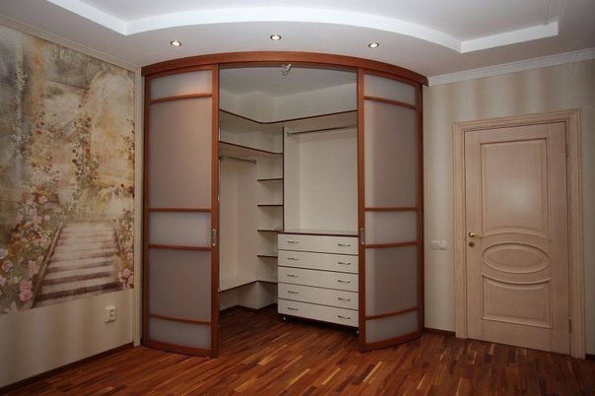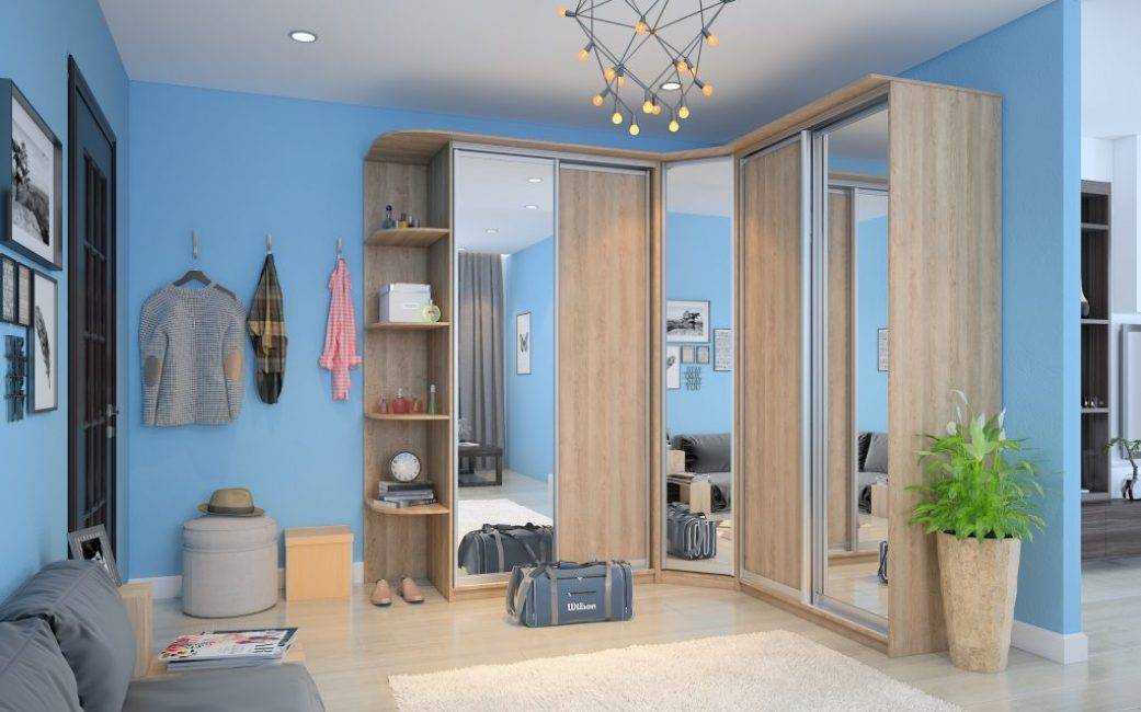 - Популярностью пользуются конструкции с угловым расположением. Сюда можно отнести Г-образные модели, пятистенные и радиусные. При этом стоит помнить, что радиусный шкаф требует много свободного места, а угловой, наоборот, компактный, но очень вместительный.