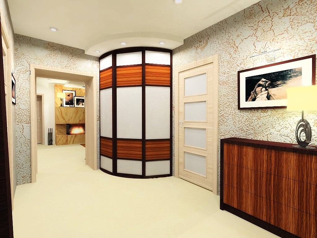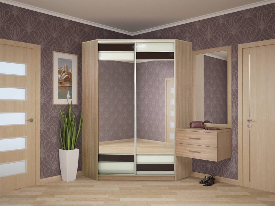 Угловые и радиусные. Подходят для просторных помещений, потому что диагональный фасад съедает много пространства. Наполнение располагается вдоль двух стен. Поэтому оправдать ограждение неиспользуемой площади можно лишь желанием наполнить явную пустоту. Использование полок, примыкающих к фасаду, затруднительно в виду треугольной формы. В радиальных проектах это неудобство проявляется в меньшей степени. При вогнутой форме фасадов в прихожей остается больше места.
