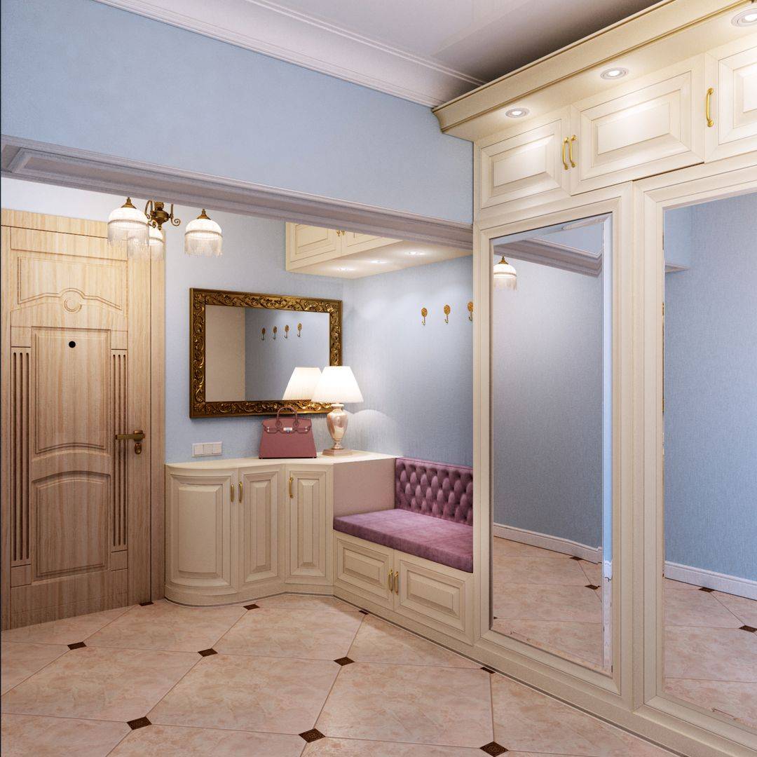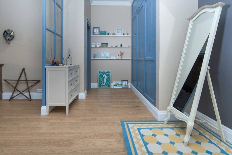 На фото распашной шкаф голубого цвета в интерьере прихожей в стиле фьюжн.