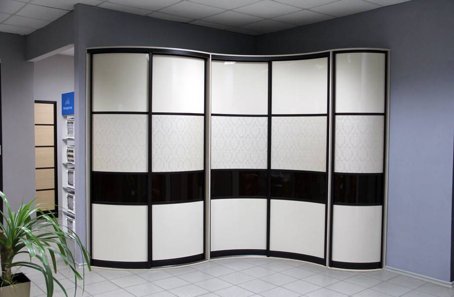 | Радиусный | Угол — мертвая зона. Фасад быть выпуклый, вогнутый или волнообразный. | Устройство стоек аналогично угловой модели с учетом особенностей фасада. Установленная в угол конструкция или штанги не должны препятствовать движению дверей. |