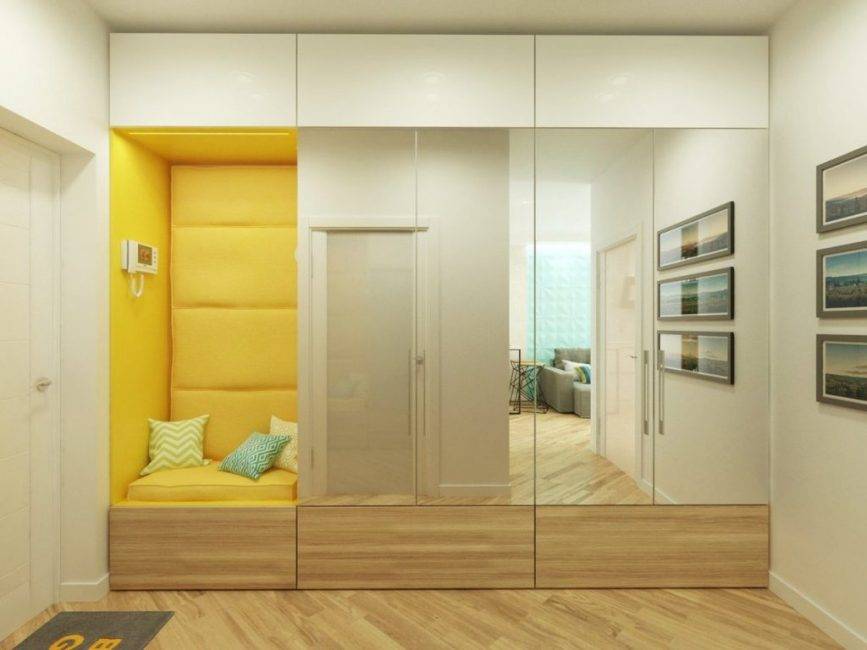 На фото коридор, оформленный желтым шкафом, комбинированным с вешалкой.