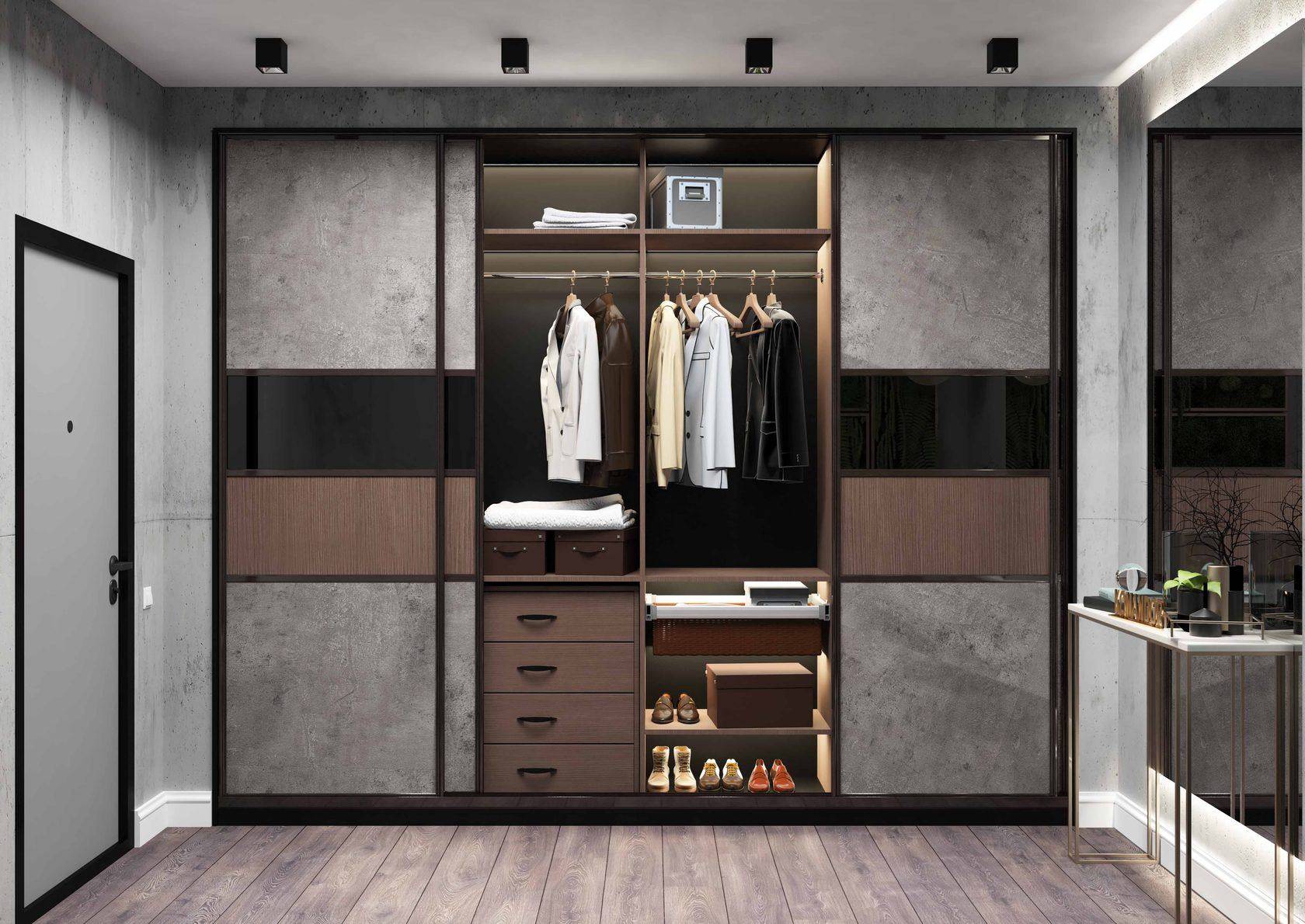 | Встроенный | Фальшпанели для монтажа полок и штанг. Верхнее или нижнее крепление механизма «купе» и направляющих для дверей. Задействует пространство от потолка до пола. | Антресоли и гардеробный лифт «пантограф» для организации верхнего яруса. Вертикальные стойки и панели для усиления конструкции внутреннего наполнения. |