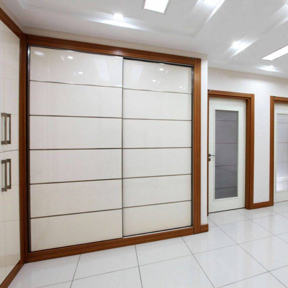 Высота такого шкафа-купе, так же как и ширина, зависит от размера ниши. Двери проектируются под расстояние от пола до потолка. Глубину делают по желанию. Планировка натяжного потолка во встроенной конструкции не рекомендуется.