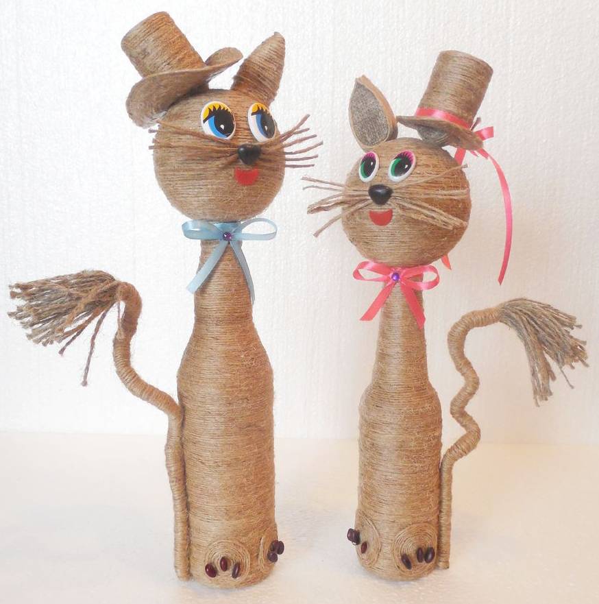 Если использовать не только джут, но и какие-то предметы для основы, то получится долговечный оригинальный аксессуар. Очень легко сделать различные фигурки из джута на базе стеклянных бутылок или ваз. Очень популярны кошки. Можно делать парные композиции. Хороши для декорирования кофейные зерна. Несколько идей таких фигурок вам на выбор.