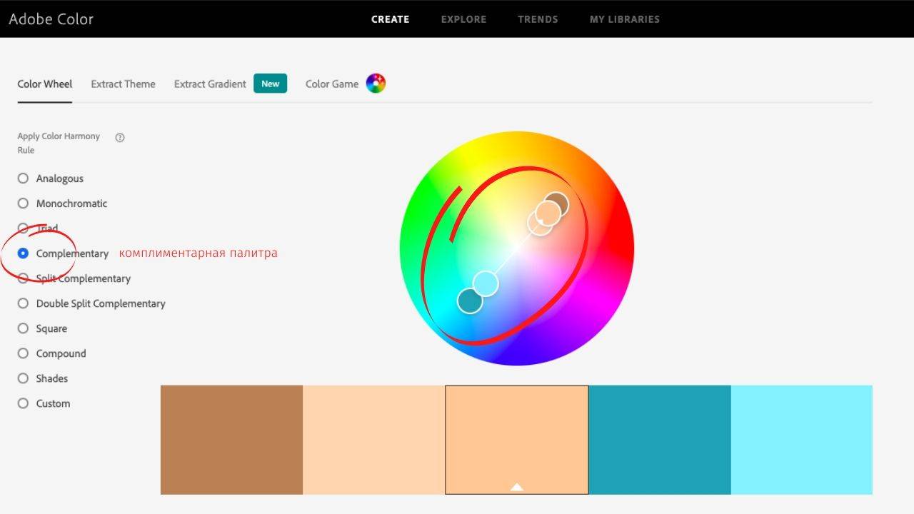 Посмотрите на палитру, которая появилась под кругом. Цвет, комплиментарный к цвету вашей вещи, можно использовать для выбора сумок, юбок, брюк, обуви и т. д. — все эти вещи будут хорошо сочетаться с топом, цвет которого вам к лицу.