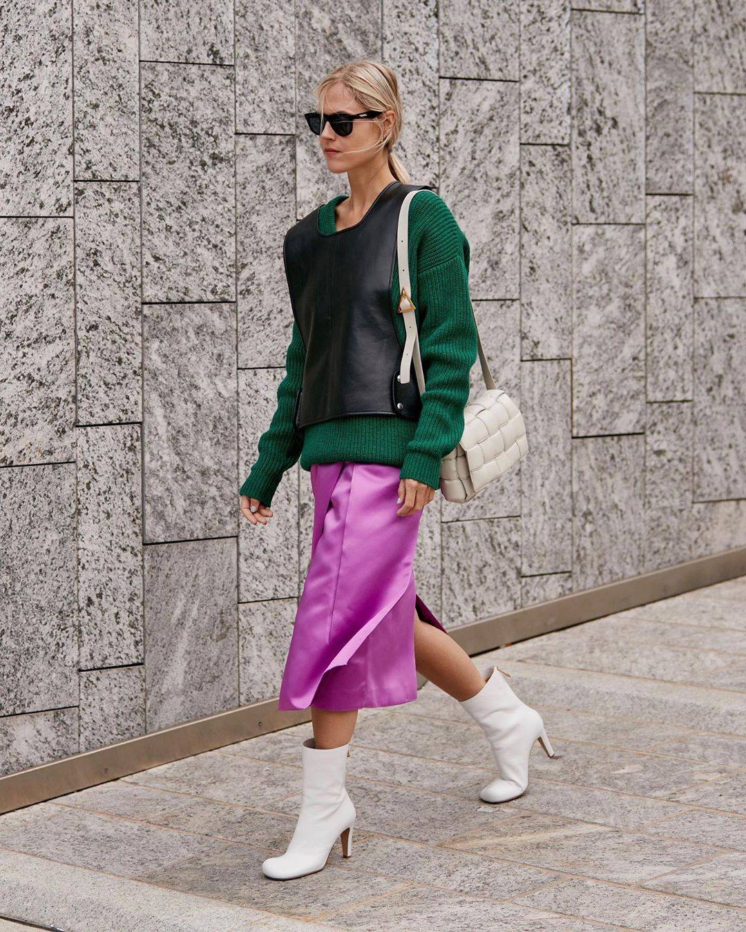 И чуть более сложный вариант — три цвета, подобранных по триадной палитре, образ мягче, чем комплиментарные сочетания. Интересным образ делает еще и разница в оттенках двух цветов палитры. Photo: @thestreetpie