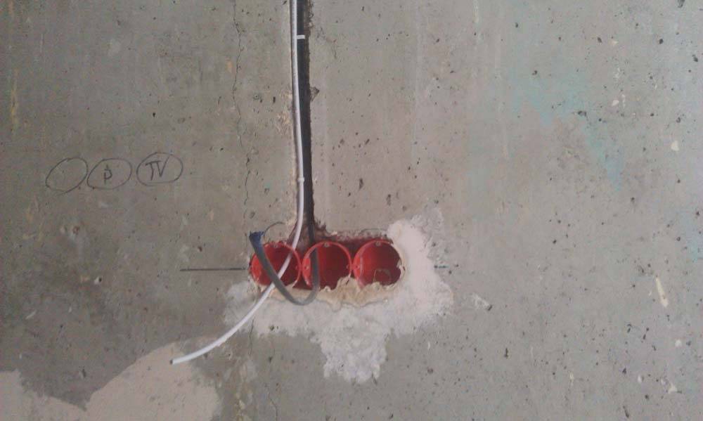 Слаботочные и силовые кабели прокладываются в разных штробах. Для установки подрозетников и распеечных коробок применяют колодцы, предварительно выдолбленные в стене.