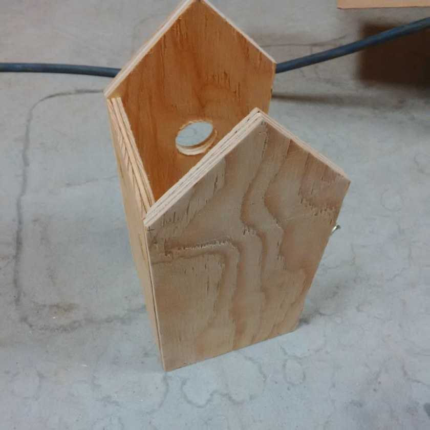 Классическая модель представляет собой деревянный короб. Для создания такой конструкции потребуются доски. Поскольку крыша будет иметь два ската, две из четырех фасадных деталей нужно запилить строго под углом 90°. На одну из них нужно нанести разметку и вырезать отверстие размером 5 см. Отступив от этого окошка примерно на 5 см вниз, необходимо выполнить еще одно отверстие, но меньшего размера. Оно будет использоваться для установки жердочки. Этот небольшой насест можно изготовить из веточки дерева.
