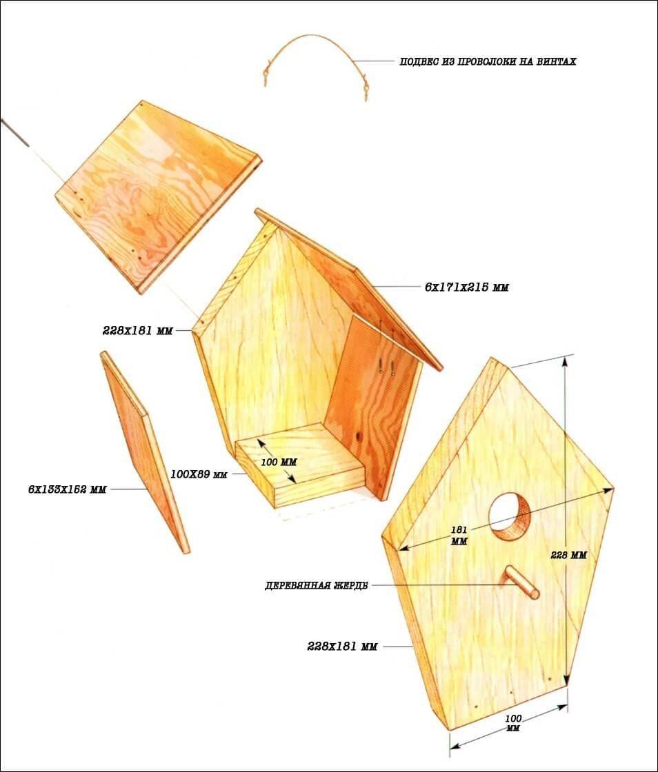 Последовательность действий для любой из предложенной выше схем скворечника из фанеры или дерева: