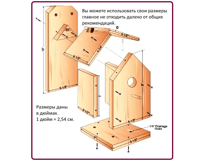 Существует несколько вариантов конструкции птичьих домиков и все они хороши. Каждый из них подразумевает один и тот же процесс сборки. Разница состоит в форме, параметрах отдельных деталей и направлении ската крыши.