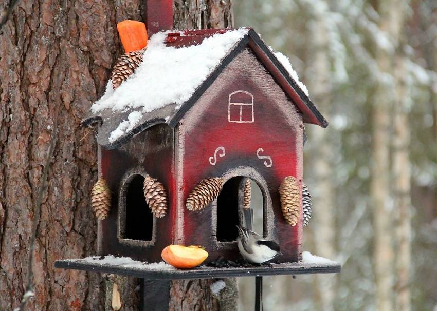 Оригинальные скворечники для птиц можно построить из старой металлической посуды (например, блюдо, плоский поднос). Для подобных материалов дополнительно строят домик, который будет защищать корм от хищных птиц и грызунов, а также оборудуют конструкцию подвесными крепежами.