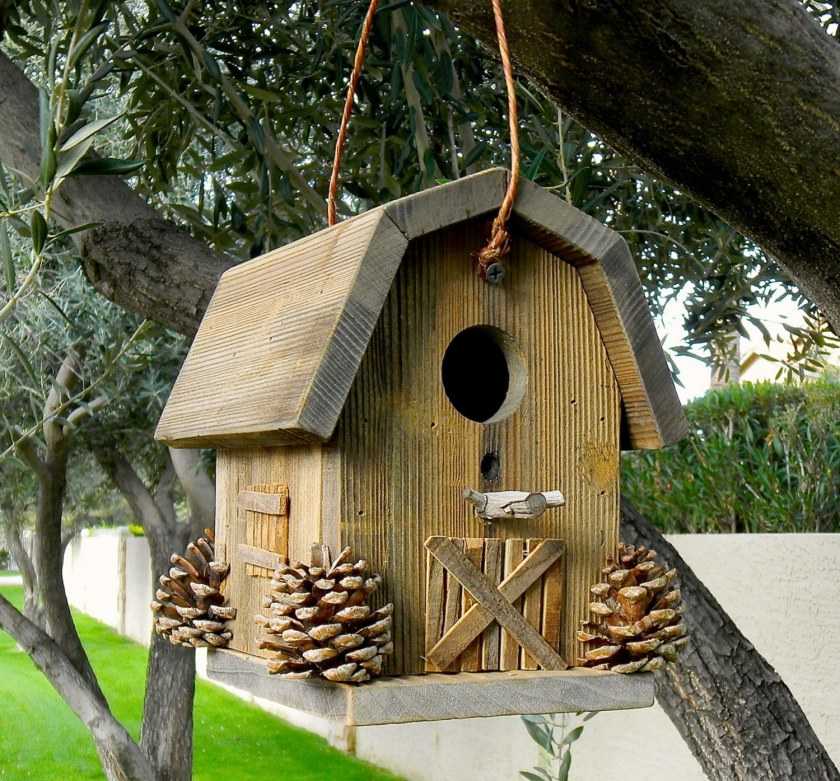 Декорировать готовый деревянный скворечник можно кусками коры или бересты, шишками, сучками и ветками. Для крыши можно использовать не цельную доску, а тонкие планки поверх листа фанеры, дранку.