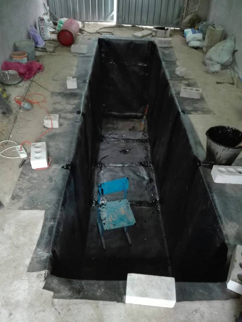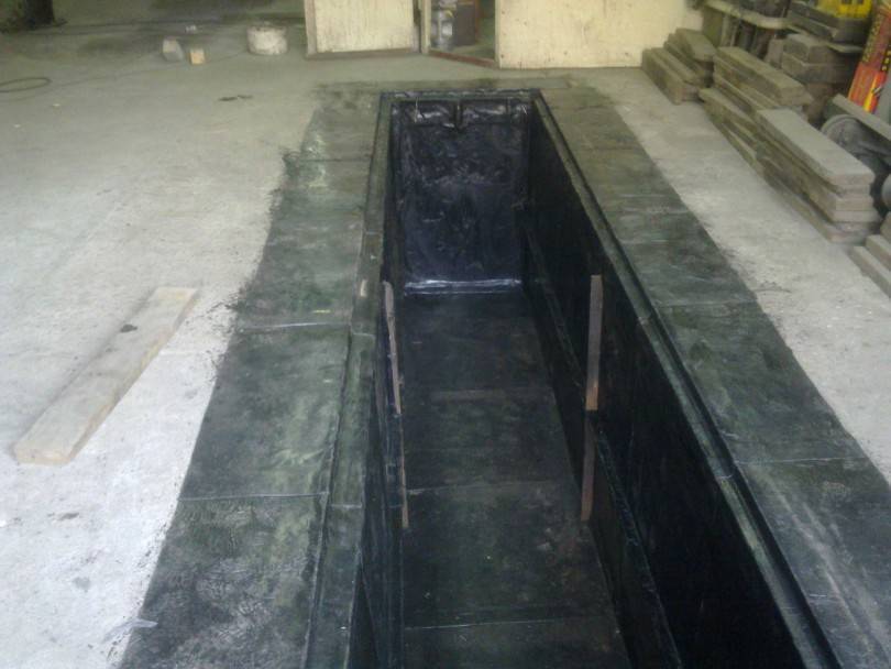 2. Возведение каркаса предусматривает двойные бетонные стены, между которыми будет находиться гидроизоляционная прослойка (акваизол, бутилкаучук или другие гидрофобные материалы или мембраны). Полотна с водонепроницаемыми свойствами выстилаются в котлован с выпуском по 15 см с каждого края. Материалы, закрывающие канаву, соединяются внахлест и склеиваются с помощью двухстороннего скотча.