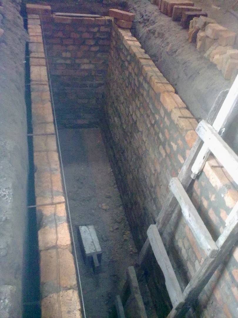 Кладка начинается с внешнего слоя. Он выполняется резанным пенобетоном толщиной 50 мм, при отсутствии такового в дело идет кирпич, поставленный на ребро. Кладка выполняется по шнуровке и периодически проверяется рейкой длиной в 125 см на предмет схождения стен. Зазор от грунта бутится битым кирпичом или щебнем каждые два ряда, с внутренней стороны следует удалить выступающие остатки раствора. После высыхания черновая кладка и пол покрываются тремя слоями обмазочной битумной изоляции. По еще не высохшему верхнему слою возможна оклейка ямы плитами пенополистирола, если того требует теплотехнический расчет пола.