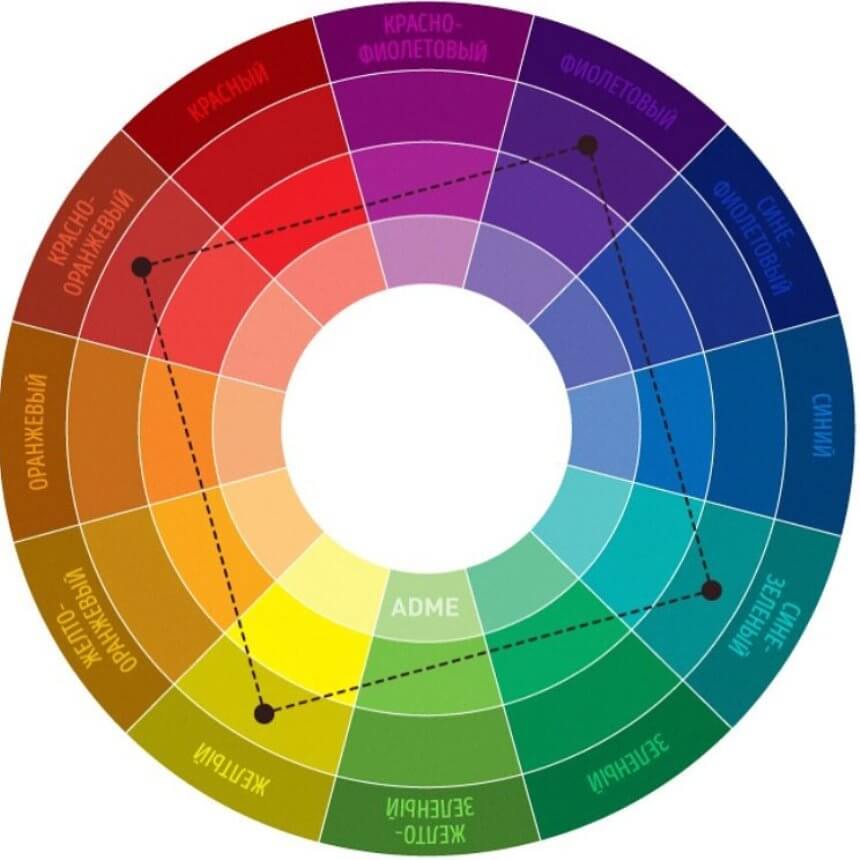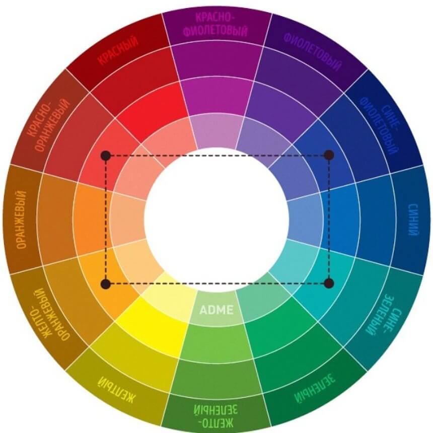 5. Прямоугольная или квадратная схема. В первом случае берут две пары противоположных спектров, а во втором все цвет равноудалены друг от друга на цветовой окружности.