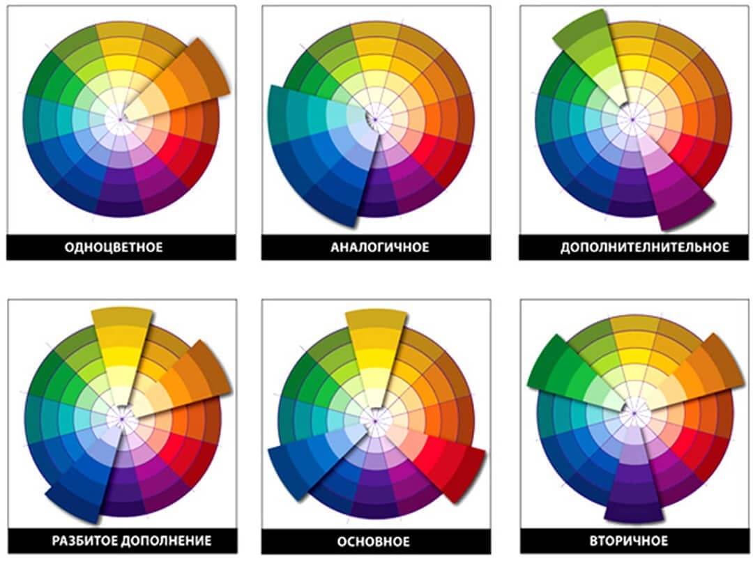 Как же пользоваться цветовым кругом? Это довольно просто, нужно только знать схемы и не бояться «играть» с колесом. Схем по сочетанию цветов в круге существует множество (см. рисунок ниже). Но есть три базовых алгоритма.
