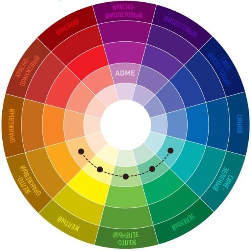 Схема 1. Монохроматическое сочетание цветов – когда комбинируются родственные оттенки из одного сегмента круга.