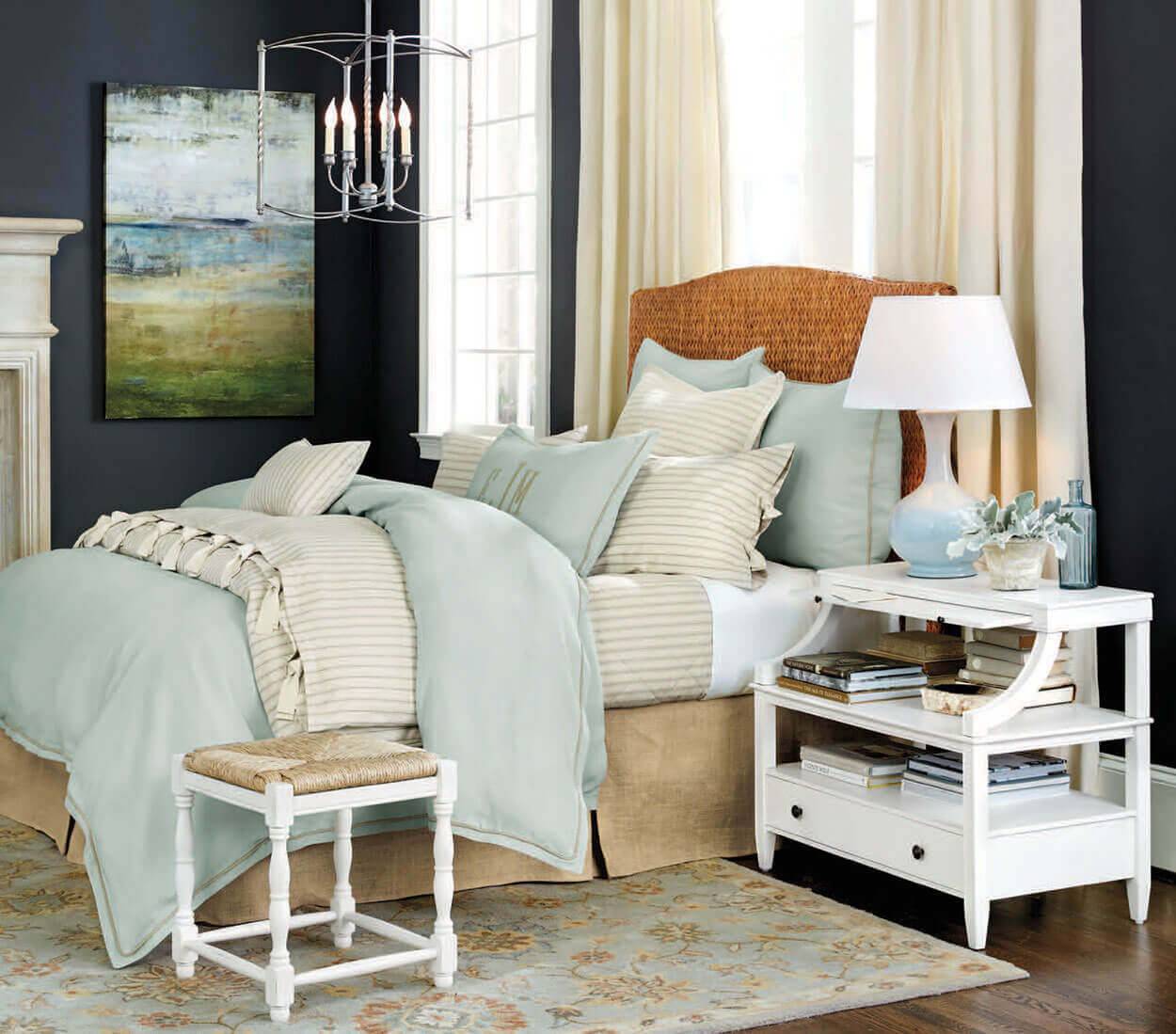 Комната в пастельных тонах с покрывалом небесного цвета и черной матовой панелью