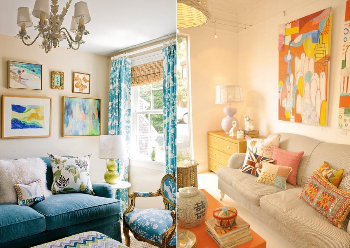 Акцентным пятном станет современная или традиционная живопись в ярких тонах, сочетающаяся с диваном, креслами, занавесками, ковриками любых оттенков пастели. Потолок предпочтителен белый – при использовании другого колера, пол вместе с плинтусами все равно делается хотя бы немного темнее, для создания устойчивости общей композиции.