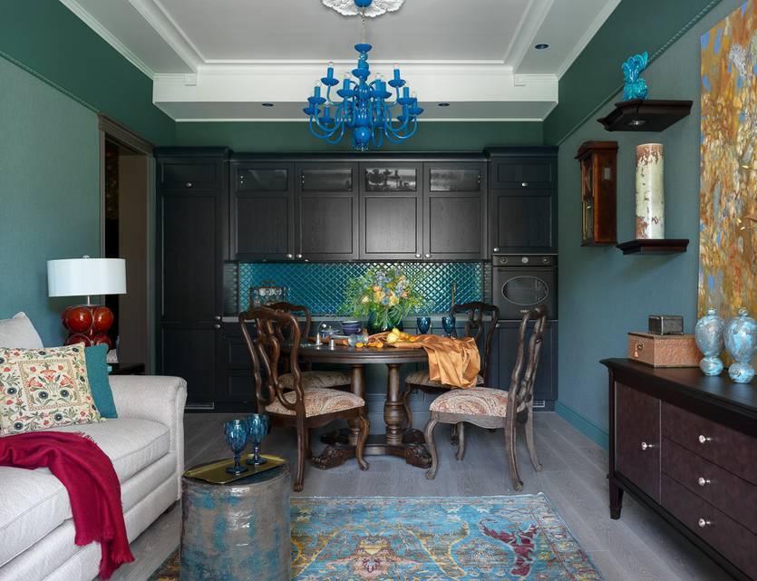 Коричневый. Самая «безопасная» комбинация для глаз. Насыщенный коричневый облагородит интерьер и подчеркнет богатство синего. Например, на кухне отлично будут вместе смотреться гжель и дерево.