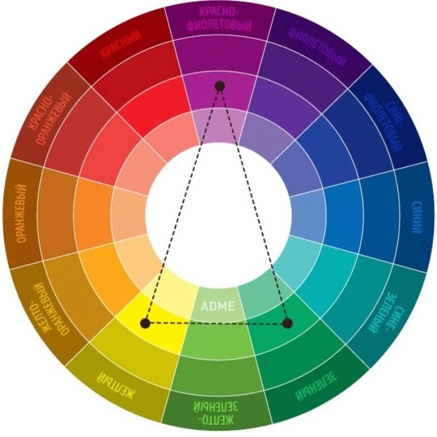 Контрастная триада похожа на комплементарную схему. К основному цвету добавляются два, расположенные рядом на цветовом круге. Можно делать акценты на мебели и аксессуарах с помощью двух последних или же оформить дизайн двумя «родственными» цветами, а акценты делать одним контрастным